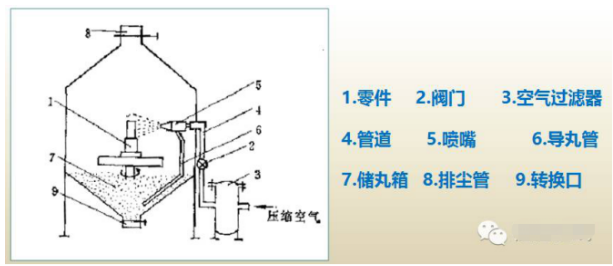二、氣動式噴丸機(壓縮空氣式),適用于要求噴丸強度適中、形狀復雜、尺寸較小的零件。
